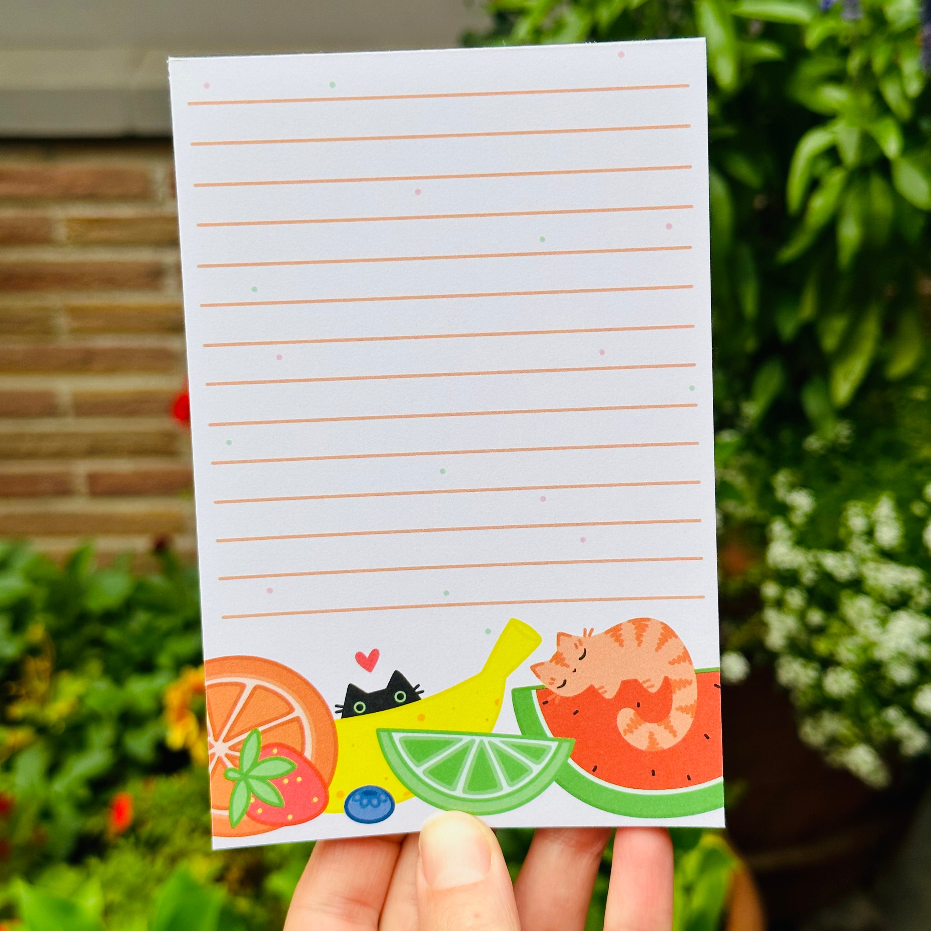 Super cute notepad with fruit cats! Perfect for grocery store lists, stationary, to due lists and more! Each notepad comes with 50 sheets of functional cuteness. Upgrade your notepad to include a 3 inch magnetic strip on the back to make it refrigerator ready! Size: 4” x 6”