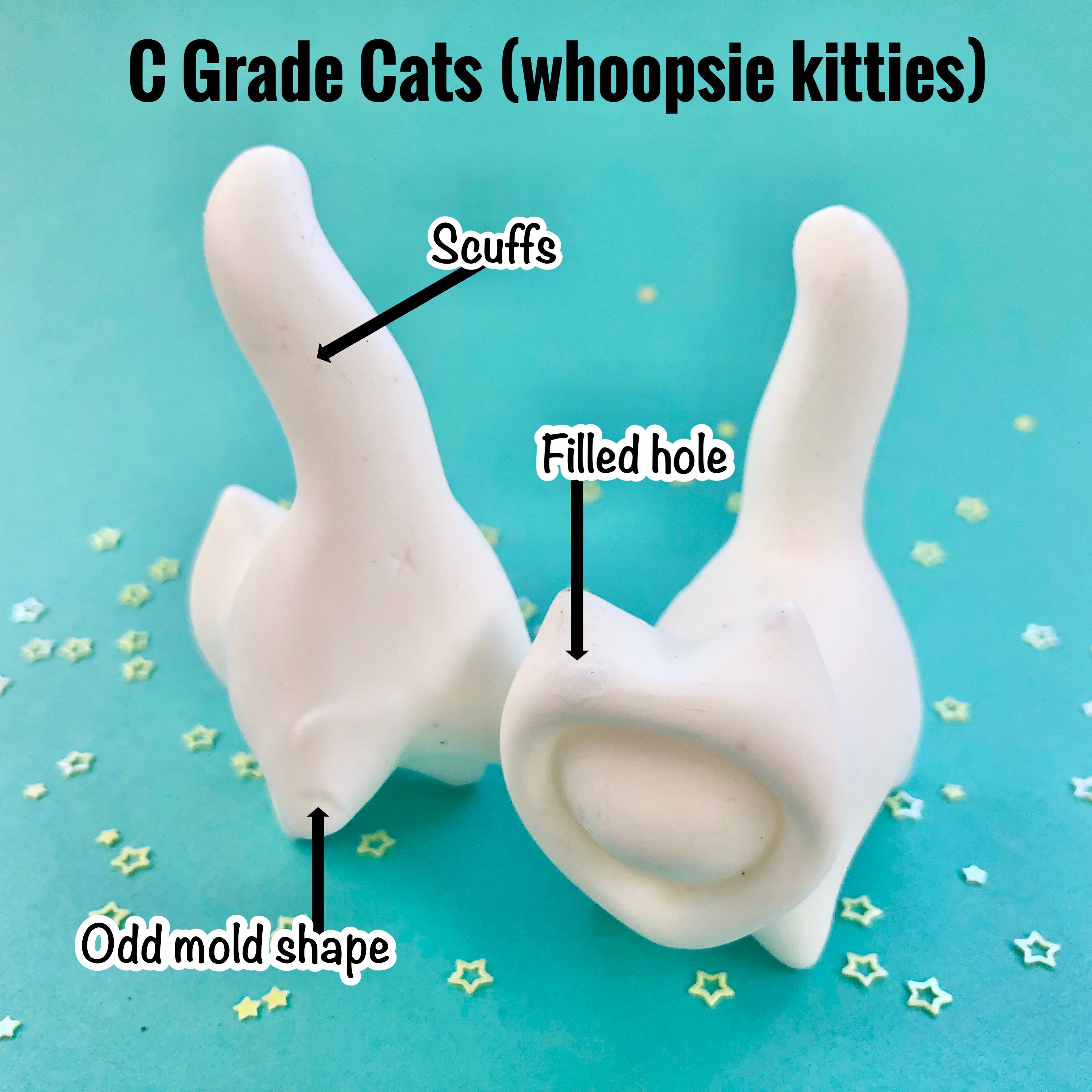 *THIS LISTING IS FOR* Whoopsie Kitties / C Grades - These are kitties that had a hard time in the mold and have misshaped tails, dents, flaws or deep mold lines. Any major holes have been filled by me with epoxy, but they require extra sanding and priming. These kitties are best for people who have experience with resin, people who don’t mind the extra polishing or a cheaper option for kids to decorate.